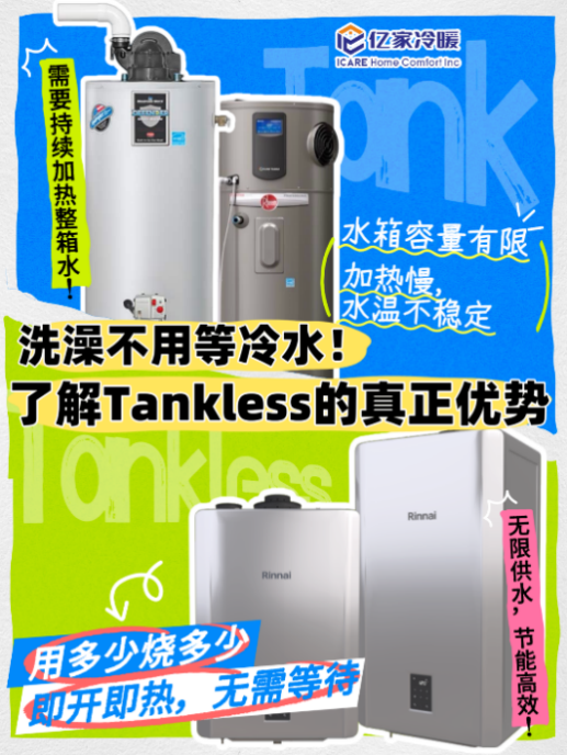 🚿 Tankless: ✅ 无限供水♾️ ✅ 连续供热不间断🔥 ✅ 多人用水更稳定 👨👩👧👦 ✅没有大水箱,结垢和腐蚀问题少⚡ ✅节能高效💸